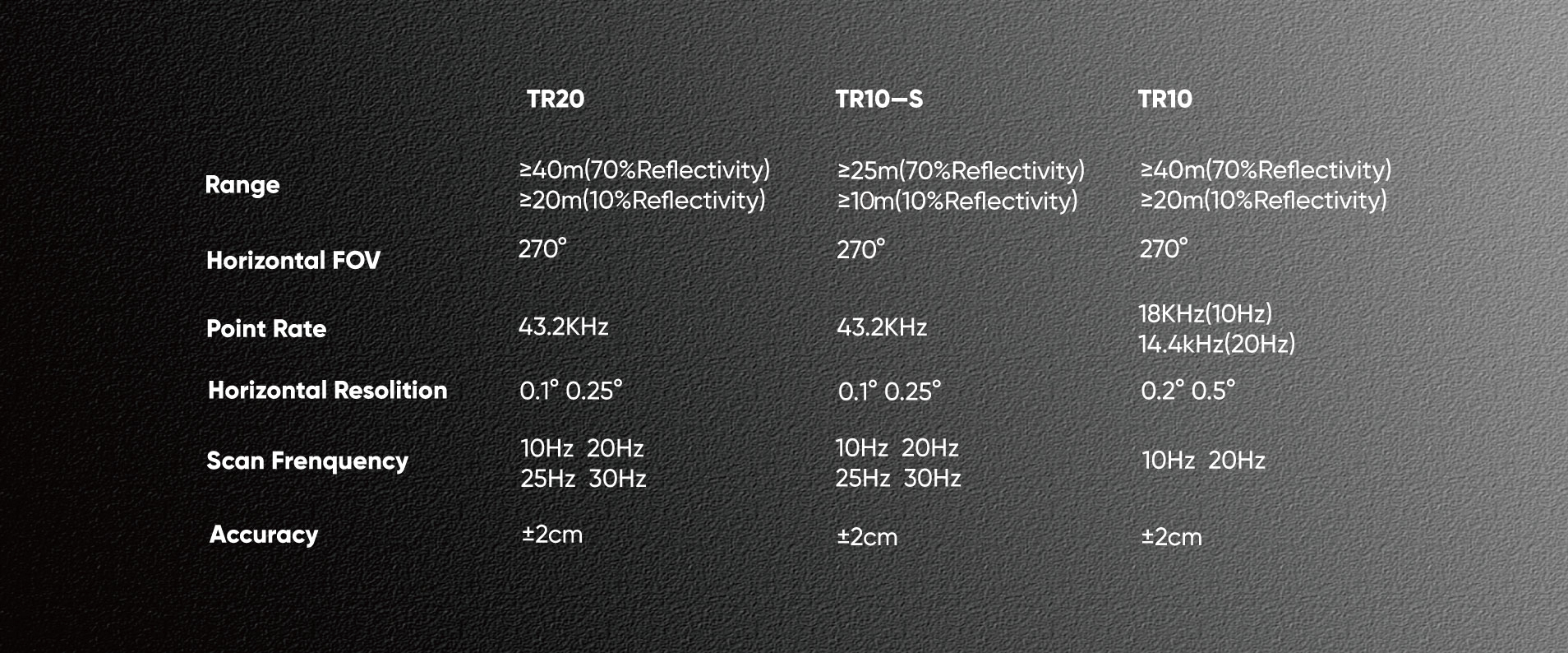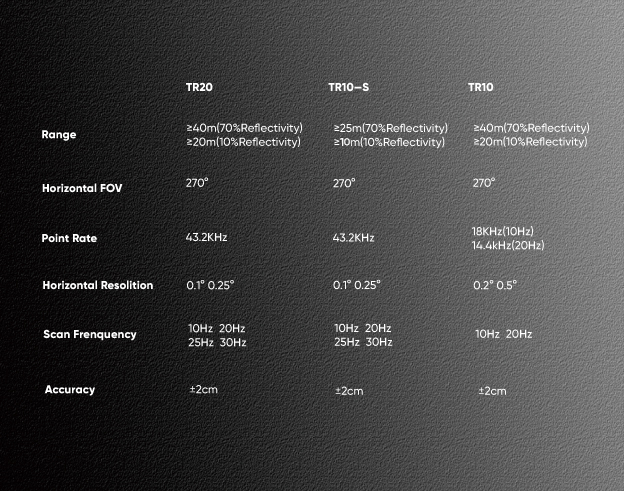 With unique target enhancement technology, TR series LiDAR could reach 20 m even at 10% reflection target